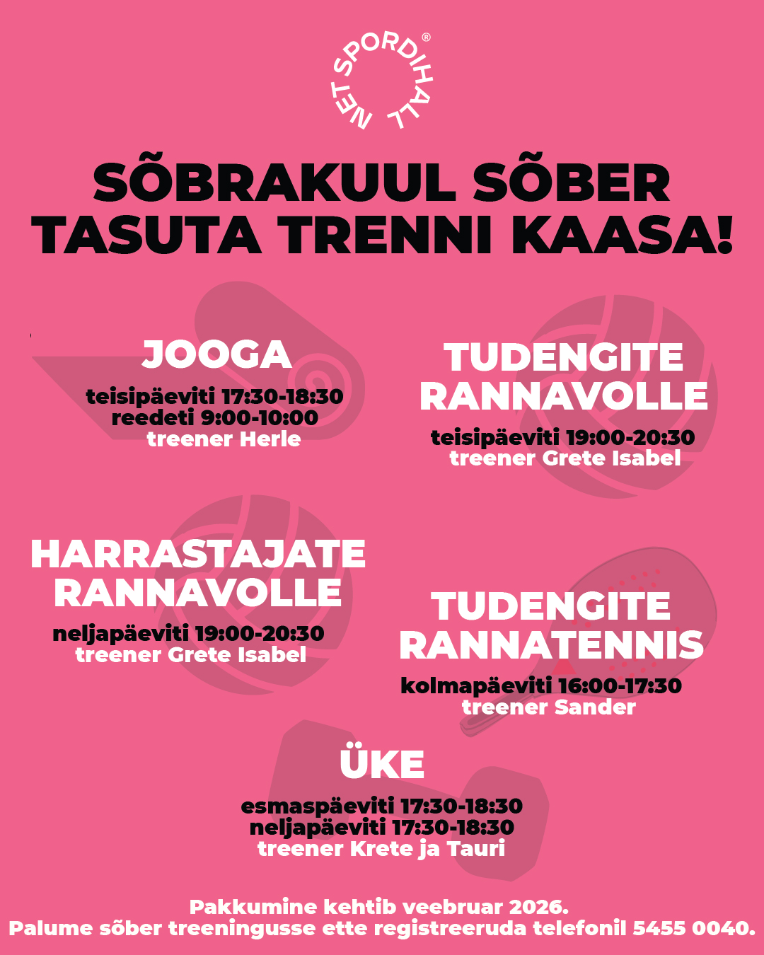 Sõbra saab kaasa võtta: tudengite ja harrastajate rannavollesse, tudengite rannatennisesse, ÜKE-sse ning joogasse. Anna sõbra tulekust ette teada telefonil 5455 0040!
