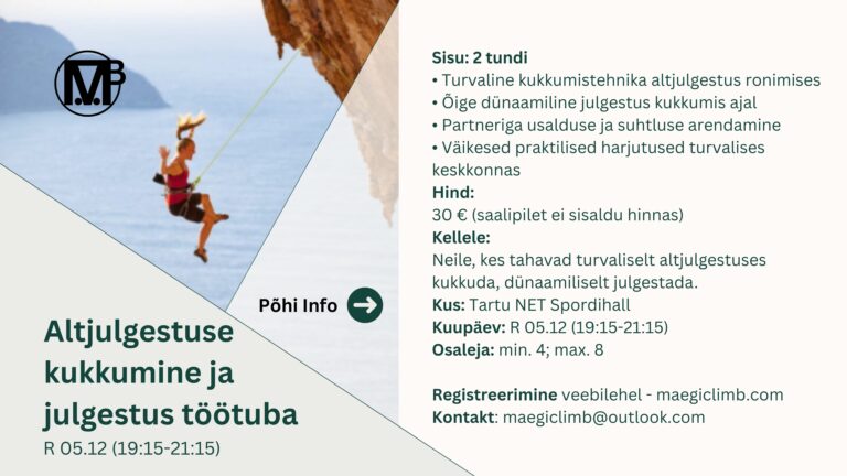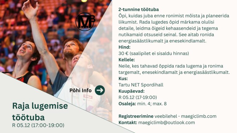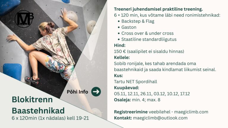 • Asukoht: Tartu NET Spordihall (Ronimissein – Boulder ala)